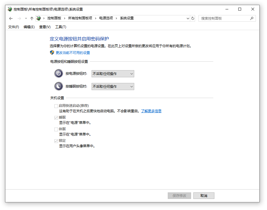 打开控制面板 -> 硬件和声音 -> 电源按钮功能