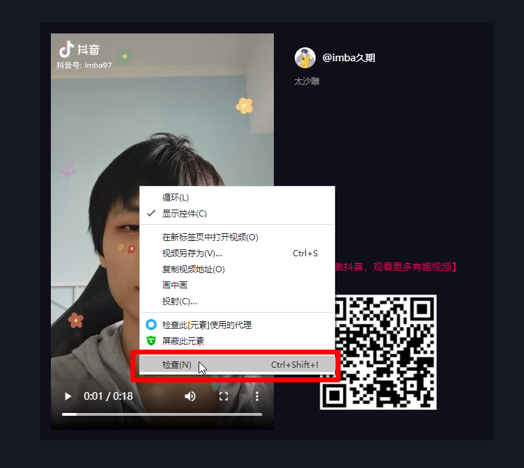 先点一下播放,让播放器加载出来,随后在视频上右键,点击“检查”