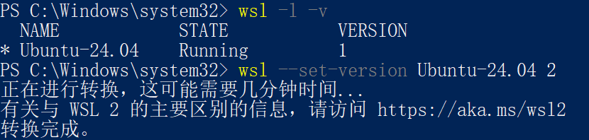 1  | wsl --set-version Ubuntu-24.04 2  |