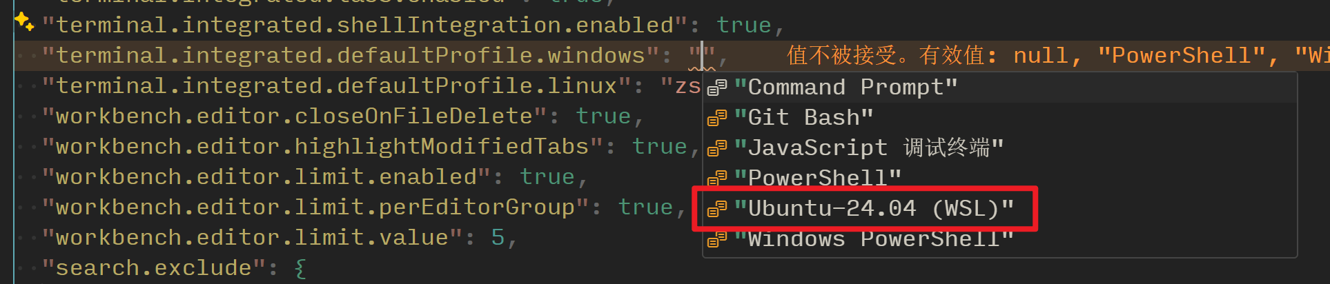 1  | "terminal.integrated.defaultProfile.windows": "Ubuntu-24.04 (WSL)",  |