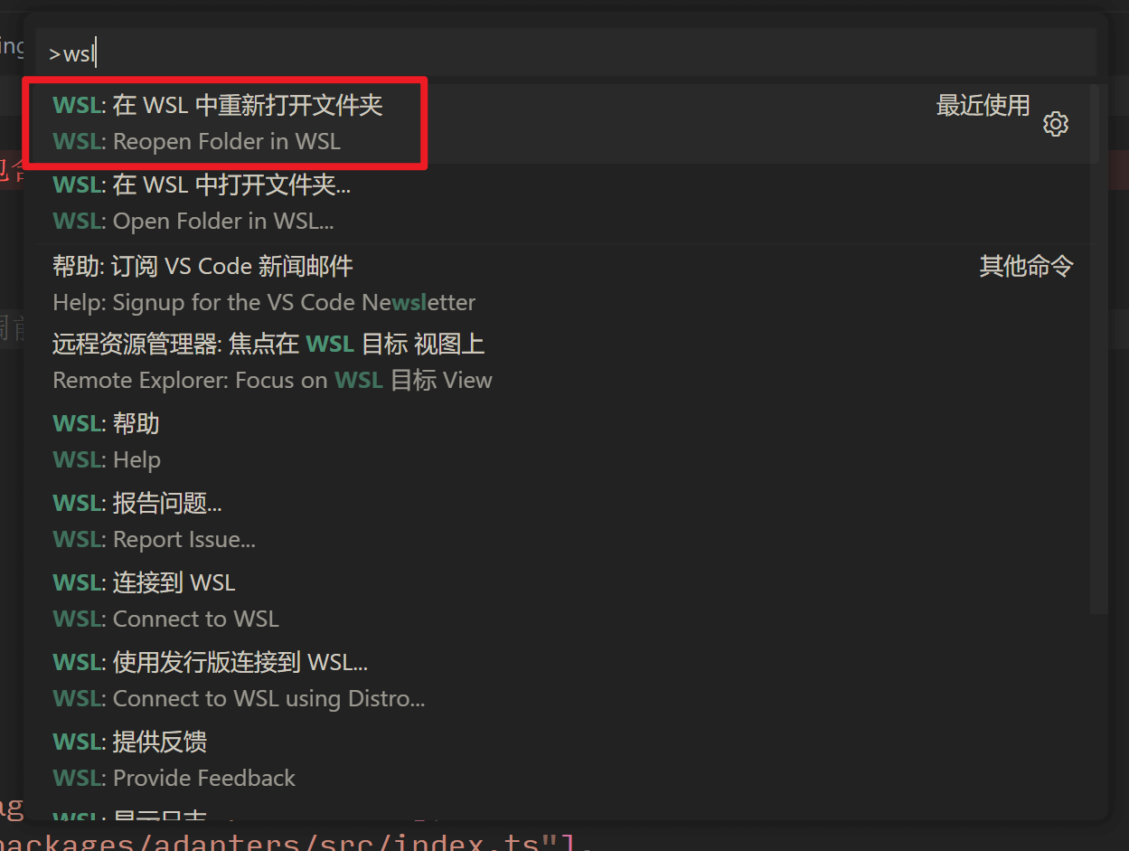 先打开原项目,然后 Ctrl + Shift + P 打开命令中心,选择在 WSL 中重新打开文件夹
