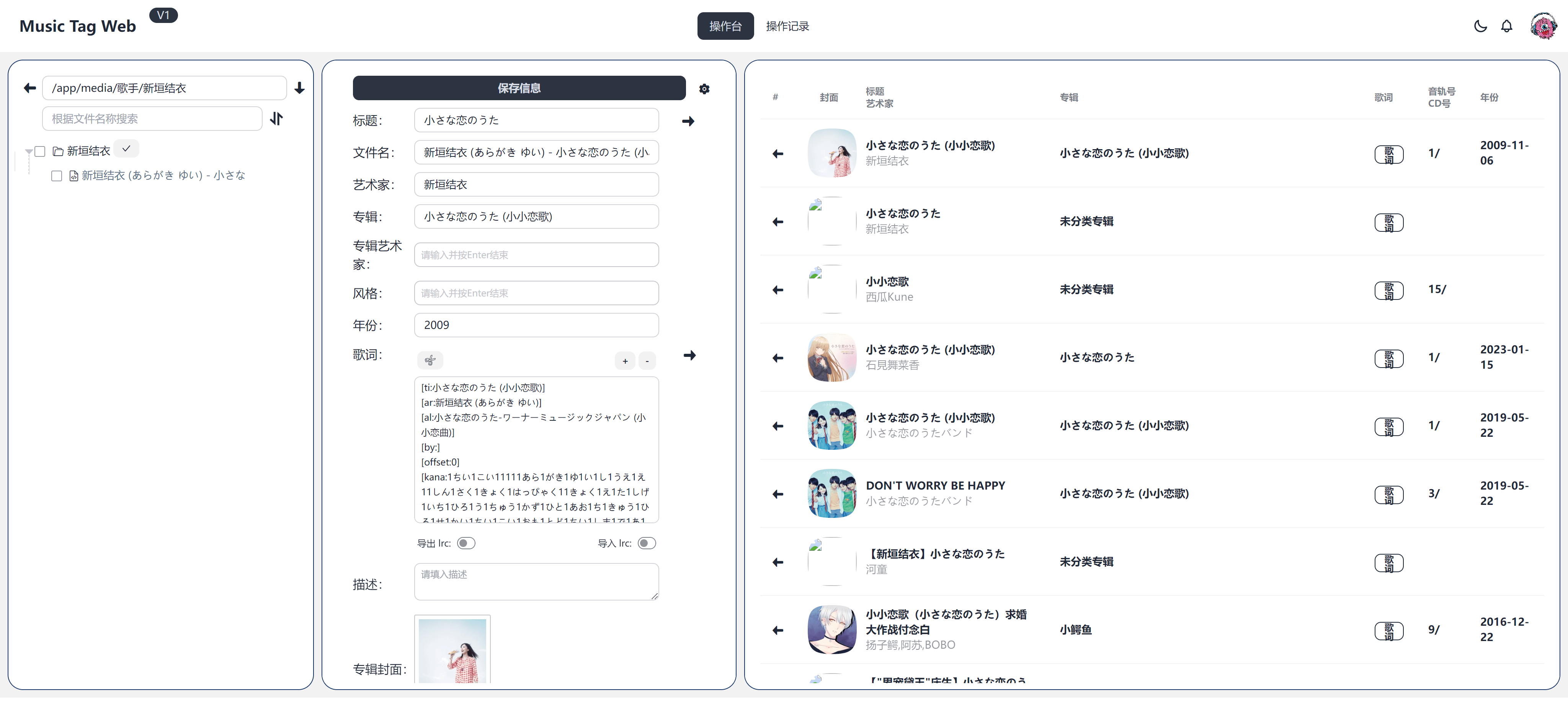 用的是 Music Tag Web,也是可通过 Docker 部署的应用,可以自动或手动搜索、写入音乐信息