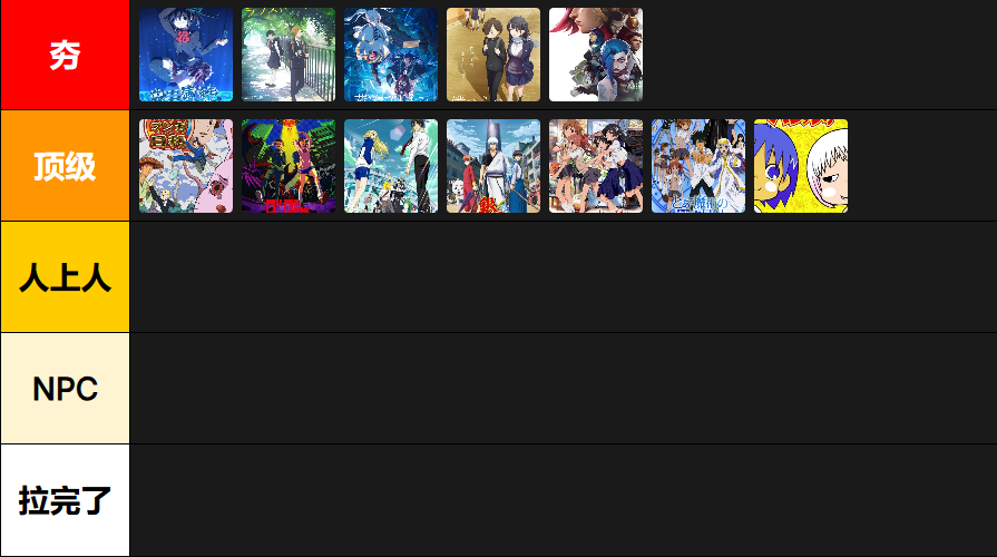 const rankings = ref({ hang: [ { title: '《中二病也要谈恋爱》', cover: '/images/1.png', url: 'https://example.com/1', description: '本人入宅作,给到一个夯' }, { title: '《玉子爱情故事》', cover: '/images/2.png' }, { title: '《葬送的芙莉莲》', cover: '/images/3.png' }, { title: '《我心里危险的东西》', description: '心理描写细腻,适合我们死宅体质', cover: '/images/4.png' }, { title: '《双城之战》', cover: '/images/5.png', description: '金克斯牛逼!' } ], upper: [ { title: '《搞笑漫画日和》', cover: '/images/6.png' }, { title: '《胆大党》', cover: '/images/7.png' }, { title: '《荒川爆笑团》', cover: '/images/8.png' }, { title: '《银魂》', cover: '/images/9.png' }, { title: '《某科学的超电磁炮》', cover: '/images/10.png' }, { title: '《魔法禁书目录》', cover: '/images/11.png' }, { title: '《热带雨林的爆笑生活》', cover: '/images/12.png' } ], middle: [], lower: [], la: [] }) </script>
